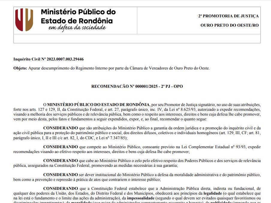 Imagem Recomendação Número 01 de 2025 do Ministério Público do Estado de Rondônia