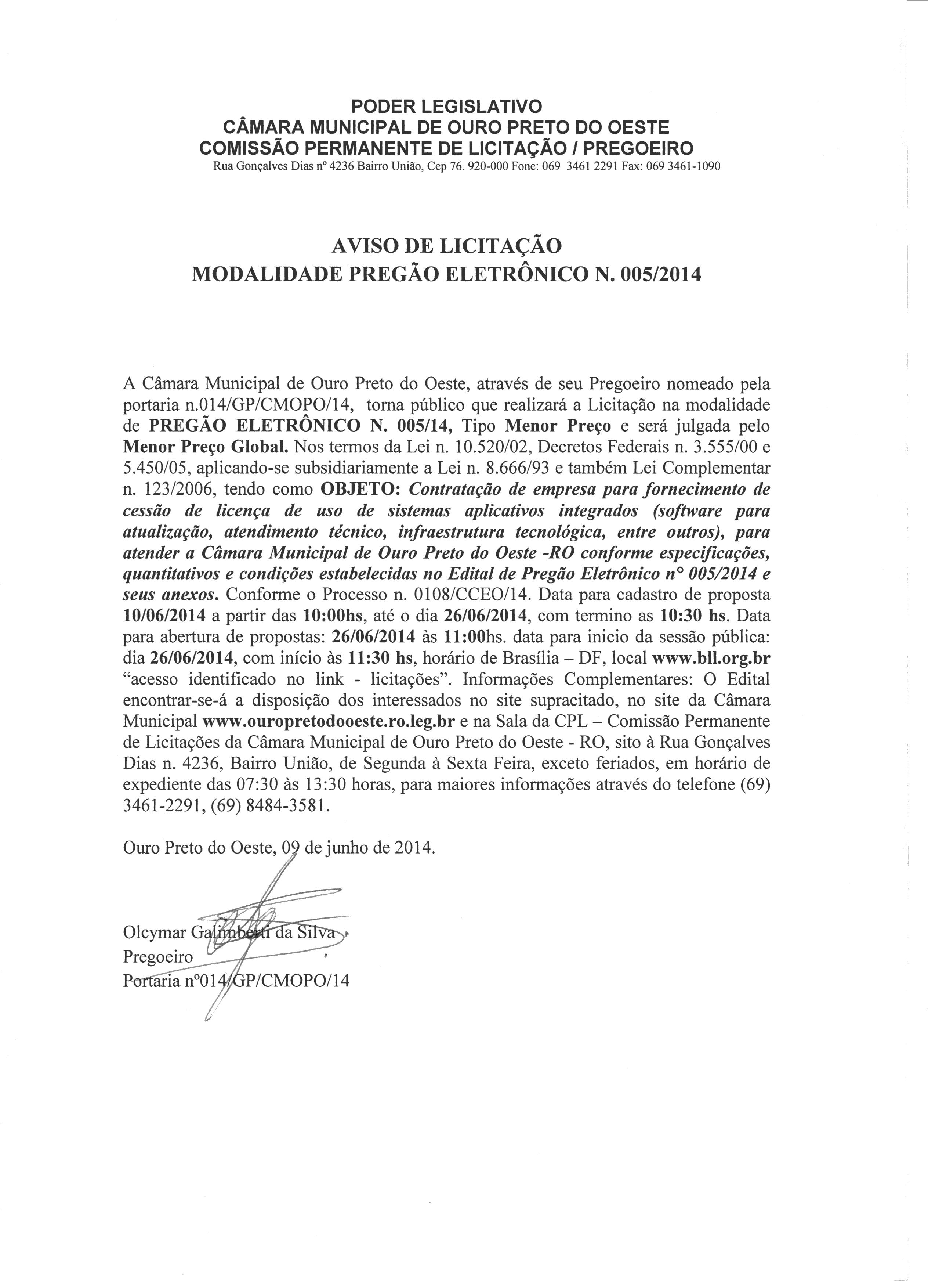 Aviso de Licitação - Pregão Eletrônico n. 005/2014